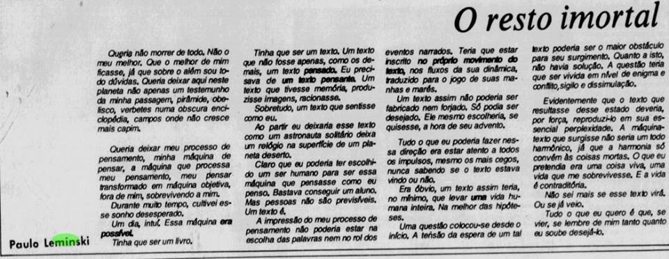 Tinha que ser um texto. Um texto que não fosse apenas, como os demais, um texto pensado. Eu precisava de um texto pensante. Um texto que tivesse memória, produzisse imagens, raciocinasse.